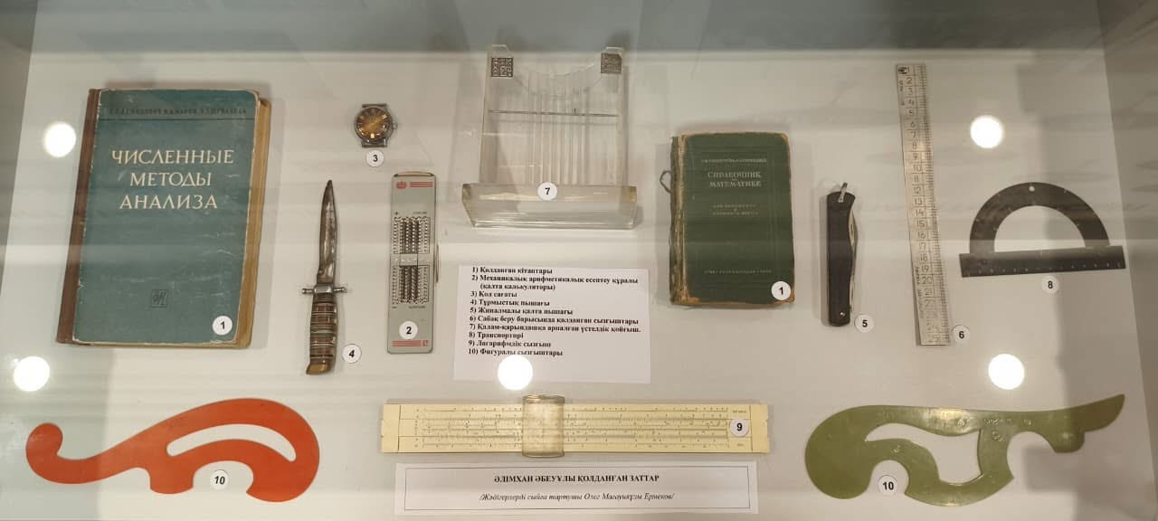 Мұражай қорына тапсырылған құнды жәдігерлер қатарында Әлімхан Әбеуұлы қолданған екі кітап, механикалық арифметикалық есептеу құралы, қол сағаты, тұрмыстық пышақ пен бәкі, сабақ барысында пайдаланған сызғыштар, транспортир, логарифмдік және фигуралы сызғыштар, сондай-ақ қалам-қарындашқа арналған үстелдік қойғыш бар.