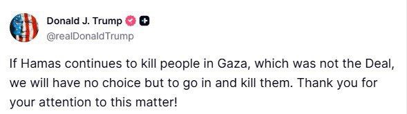 АҚШ президенті Дональд Трамп Truth Social желісінде ХАМАС ұйымына қатаң ескерту жасады, деп жазады Alash.kz.