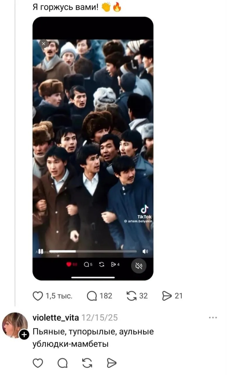 Қазақстанның құқық қорғау органдары 1986 жылғы Желтоқсан көтерілісіне қатысқан тұлғалардың намысына тиіп, қорлау мазмұнында пікір білдірген әйелге қатысты тергеу амалдарын бастады, деп жазады Alash.kz.