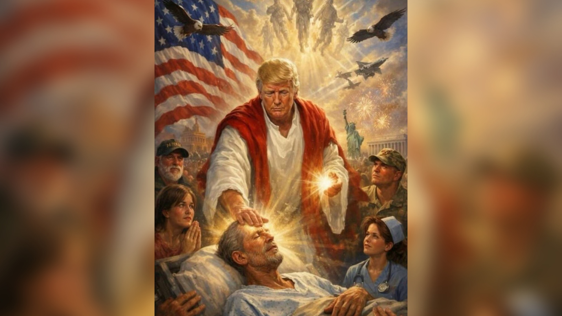 Даулы суретте ақ киім киген президент америкалық мемлекеттік нышандардың аясында адамдарға «шипа қондырып» жатқан сәті көрсетілген. Кейінірек Дональд Трамп бұл бейнеге қатысты түсініктеме беріп, өзін пайғамбар емес, мұқтаж жандарға жәрдем беріп жатқан «дәрігер» ретінде көрсеткісі келгенін айтып ақталды.